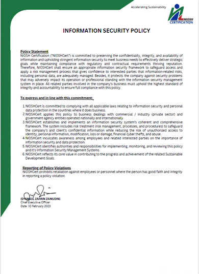 Polisi Keselamatan Maklumat ini dibangunkan bagi menyatakan komitmen NIOSHCert dalam melindungi, memelihara kerahsiaan, integriti dan ketersediaan maklumat dari sebarang ancaman.