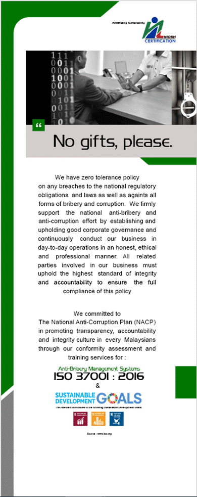 - Kakitangan / ejen dibenarkan menerima pemberian hadiah tertakluk oleh kelulusan NIOSHCert (Bahagian Kelestarian) jika dalam keadaan penerimaan hadiah itu sukar ditolak semasa menjalankan tugas awam seperti akan memalukan sipemberi atau menimbulkan keadaan serba salah.