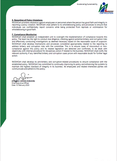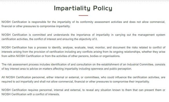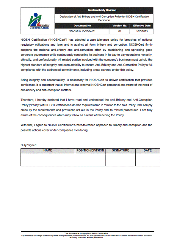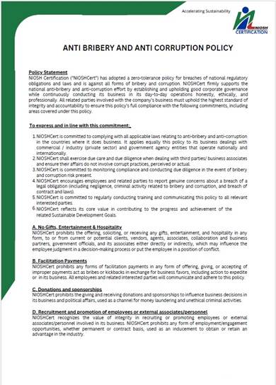 Polisi Anti Rasuah dan Anti Korupsi telah dibangunkan sebagai satu komitmen yang diterapkan dalam NIOSHCert untuk memerangi kegiatan rasuah, penyalahgunaan kuasa atau penyelewengan dan menekankan aktiviti perniagaan secara beretika, berintegriti dan jujur, dalam mengatasi kelemahan governans dan pelanggaran integriti.