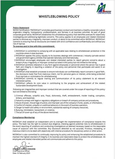 Polisi Perlindungan Pemberi Maklumat ini bertindak sebagai sebuah sistem pemberitahuan maklumat untuk membolehkan warga NIOSHCert atau orang awam untuk membuat sebarang pendedahan mengenai mana-mana salah laku dari peringkat awal kepada seseorang yang telah dilantik oleh NIOSHCert termasuk ejen tanpa rasa gentar terhadap sebarang tindak balas agar masalah dapat ditangani dengan efektif dan segera.