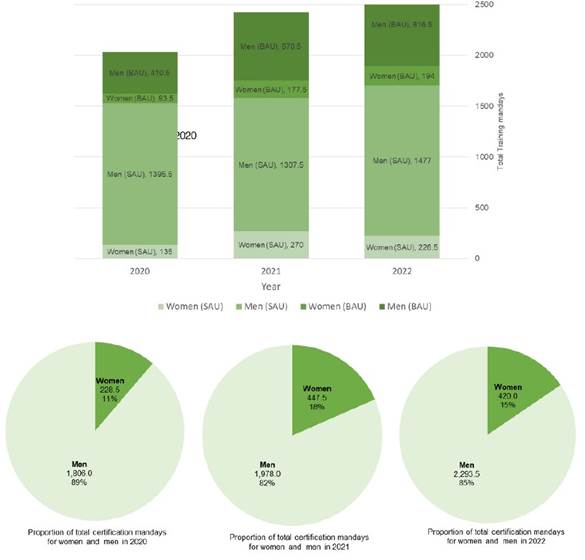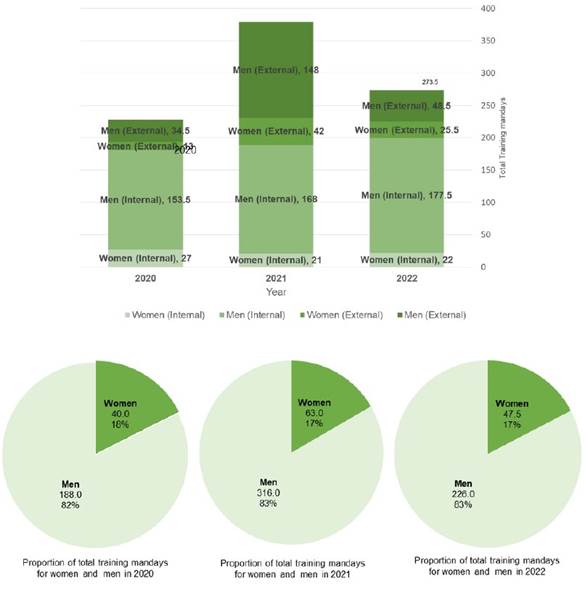 Women and men in training job opportunities by the year